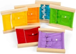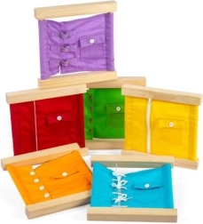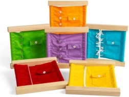 Sechs verschiedene Verschlussmechanismen vermitteln Kindern Schritt für Schritt praktische Anziehfertigkeiten.
