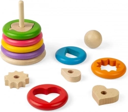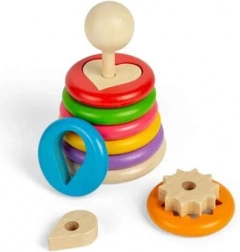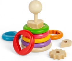 Dieses originelle Stapelspiel enthält sieben Holzringe, von denen jeder eine andere Form verbirgt – zum Beispiel Herz, Stern, Blatt oder Zahnrad. Zuerst ordnen Kinder die passende Form dem Ring zu und fädeln anschließend das gesamte Teil auf den Holzstab. Ein spielerischer Weg, Formen, Größen und räumliches Verständnis zu begreifen.
