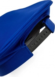 Blaue Kappe, glänzender schwarzer Schirm, gelbes Zug-Emblem