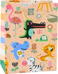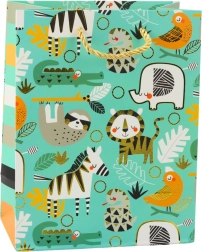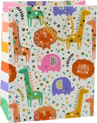 Diese Papiertasche mit Safari-Tiermotiven verleiht Ihren Geschenken Charme. Jede Tasche hat ein robustes und farbenfrohes Design, das jeden anspricht. Solide Griffe bieten bequeme Handhabung, während die ansprechenden Muster voller glücklicher Tiere sowohl Kinder als auch Erwachsene begeistern.