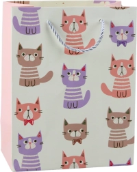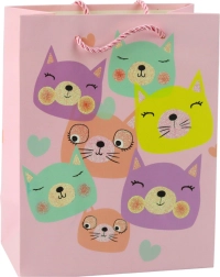 Geschenktasche mit niedlichen Katzenmotiven in Pastellfarben und Brokat-Elementen.