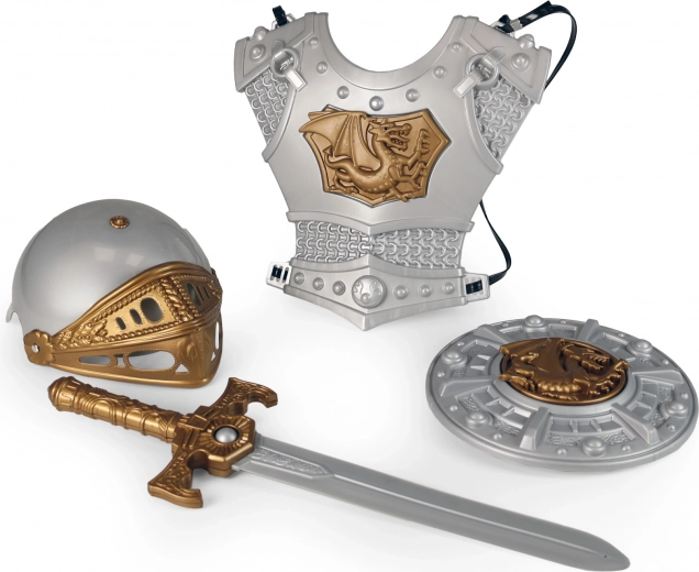 Verwandeln Sie das Spiel in ein episches Abenteuer mit diesem kompletten Rittersatz für Kinder. Enthält Helm, Brustpanzer, Schwert und Schild in einer eleganten Kombination aus Silber und Gold. Leichter Kunststoff ist für Kinder sicher und bequem, während die detailreiche Verarbeitung mit Drachenmotiv die Fantasie und Rollenspiele zu Hause und im Freien fördert.