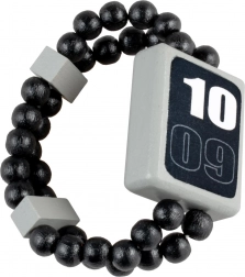Schwarz (Perlen), grauer Holzblock mit Druck