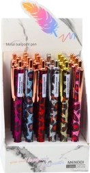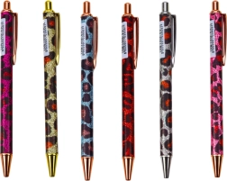 Setzen Sie auf Eleganz und Zuverlässigkeit. Der Metall-Druckkugelschreiber mit Leopardenmuster macht sowohl auf dem Schreibtisch als auch im Federmäppchen eine gute Figur und hält dank des robusten Metallgehäuses dem täglichen Gebrauch stand. Zur Auswahl stehen moderne Gehäusefarben: Schwarz, Rot, Rosa, Gold und Silber.