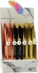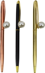 Dieser stilvolle Kugelschreiber besticht durch ein zeitloses Design, das ein Metallgehäuse mit einem markanten Perlenabschluss kombiniert. Er ist in beliebten Gehäusefarben – Gold, Schwarz und Roségold – erhältlich und wird zum eleganten Begleiter für den Alltag ebenso wie für besondere Anlässe.