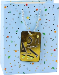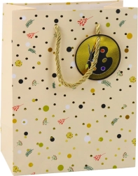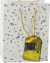 Diese Geschenktasche vereint elegantes Design und praktische Robustheit. Zarte Punkte, Blumen- und Blattmuster werden durch glänzende goldene Details und ein beiliegendes Kärtchen mit Motiven wie Bücher, Taschenrechner oder Malpalette ergänzt. Mit den Maßen 32 × 26 × 12 cm bietet sie Platz für kleine bis mittelgroße Geschenke.