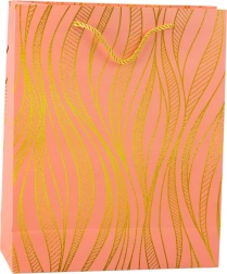 Diese stilvolle Geschenktasche besticht durch ein elegantes goldenes Wellenmotiv auf farbigem Untergrund und eine robuste Konstruktion, die auch schwerere Überraschungen sicher trägt. Farblich abgestimmte Kordelgriffe gewährleisten einen komfortablen und sicheren Transport.