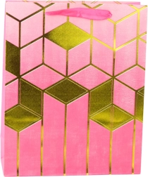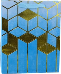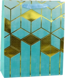 Stilvolle Geschenktasche aus festem Zierkarton mit geometrischem Goldmuster in modernen Farben. Robust, elegant und ideal für größere Geschenke zu Geburtstagen, Hochzeiten oder anderen feierlichen Anlässen.