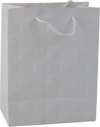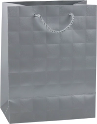 Diese stilvolle Geschenktasche überzeugt mit klarer Optik und einer feinen Textur geprägter Quadrate, die modern und zugleich edel wirkt. Dank des robusten Zierkartons und der hochwertigen Kordelgriffe ist die Tasche langlebig und auch für schwerere Geschenke geeignet.