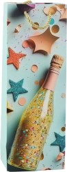 Verleihen Sie Ihrem Geschenk Pfiff und eine sichere Verpackung. Diese Flaschentasche in pastelligen Tönen von Rosa, Beige, Gold und Blau besticht durch einen modernen, festlichen Look mit Champagnerflasche, Sternchen und Konfetti. Der robuste Zierkarton trägt zuverlässig auch schwerere Flaschen, und der geflochtene goldene Griff sorgt für bequemes Tragen.
