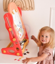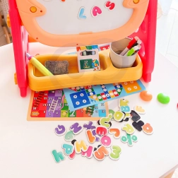 Alles ist enthalten, was Kinder brauchen: magnetisches Alphabet und Ziffern, Marker, Kreiden, Schwamm, eine praktische Ablage und ein Becher für Zubehör sowie zwei Brettspiele für gemeinsamen Spaß. Kompakte Maße erleichtern die Platzierung im Kinderzimmer.