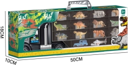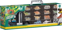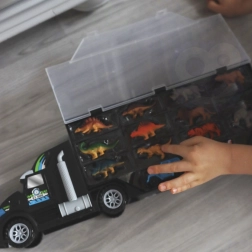 Entdecken Sie den multifunktionalen Laster, der zugleich praktischer Koffer und unterhaltsame Abschussstation ist. Die zweiseitige Ladefläche mit transparentem Deckel fasst insgesamt 24 Figuren oder Autos, sodass alles seinen Platz hat und nichts verloren geht. Das Set umfasst 6 Dinosaurier, 6 Tiere, ein kleines Auto und einen Hubschrauber – alles sofort spielbereit.
