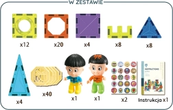 Verschiedene magnetische Bauteile, 2 Figuren, Aufkleber, Anleitung
