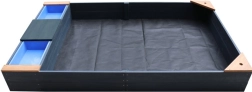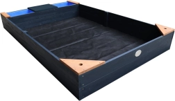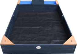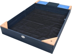 Hemlock-Holz ist splitterfrei und widerstandsfähig gegen Fäulnis. Abdeckung und Vlies schützen den Sand vor Verschmutzungen und Unkraut.
