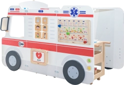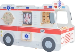 Kinder fahren, versorgen und disponieren – alles in einem robusten Holzfahrzeug mit vielen interaktiven Elementen, die ins Spiel hineinziehen.