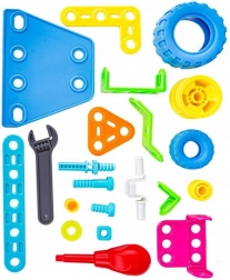 - 118 Teile: Bauelemente in verschiedenen Formen, Räder, Schrauben und Muttern, Schraubendreher und Maulschlüssel