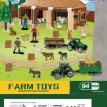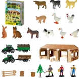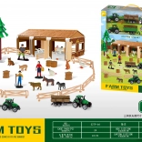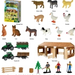 Das Komplettset umfasst Tiere, drei Spielfiguren, zwei Traktoren mit abnehmbaren Anhängern, eine Scheune, Gehege und viele Zubehörteile – alles für den Bau des eigenen Bauernhofs.