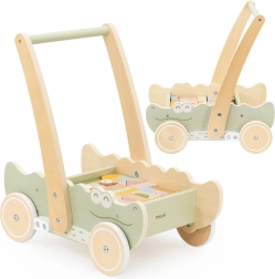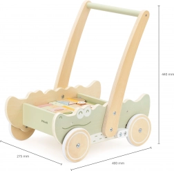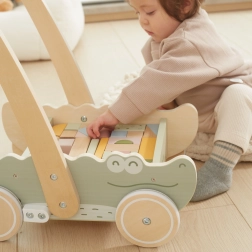 Erleben Sie die Freude der ersten Schritte mit der Lauflernhilfe in Krokodilform. Die stabile Holzkonstruktion bietet die nötige Unterstützung und ermöglicht es Kindern, die Welt um sie herum sicher zu erkunden. Der Lauflernwagen ist mit einem ergonomischen Griff ausgestattet, der den Kindern hilft, das Gleichgewicht zu halten.