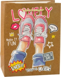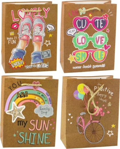Die Tasche zeichnet sich durch vier verschiedene Motive aus, die jeweils mit lebendigen Farben und positiven Sprüchen begeistern, die den jugendlichen und optimistischen Charakter unterstreichen. Starke Seilgriffe sorgen für bequemen Transport und passen farblich zum Design. Die Tasche mit den Maßen 23 x 18 x 10,5 cm ist ideal zum Verpacken von mittelgroßen und kleineren Geschenken wie Kosmetika, Accessoires, Büchern oder Süßigkeiten.