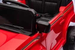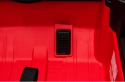 Der Innenraum überzeugt mit einem bequemen Kunstledersitz mit Gurten, einem funktionsfähigen Audio-Panel (Bluetooth, USB, MP3), vorderen LED-Scheinwerfern und Bedienelementen am Lenkrad (Hupe, Sounds). Für Sicherheit sorgt die 2,4-GHz-Fernbedienung mit drei Geschwindigkeiten und Not-Stopp.