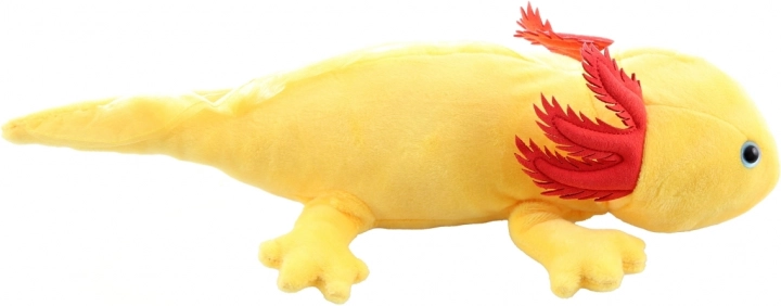 Gelber Körper mit roten äußeren Kiemen und sorgfältig verarbeiteten Nähten machen den Axolotl zur bezaubernden Deko und Spielgefährten.