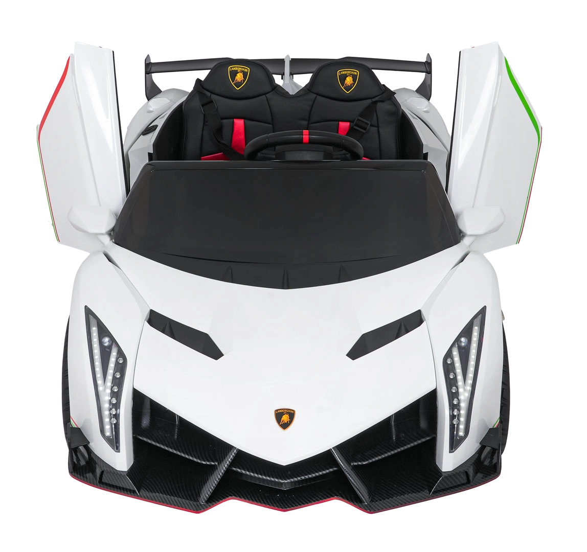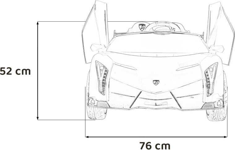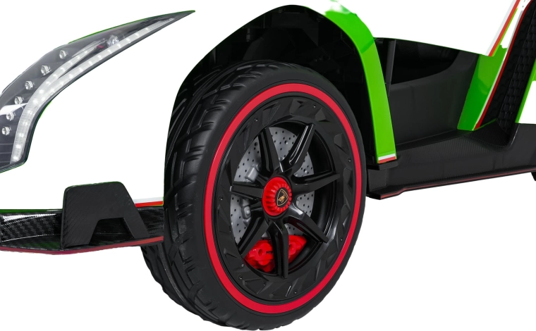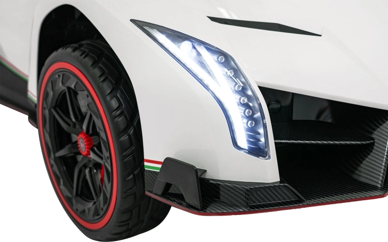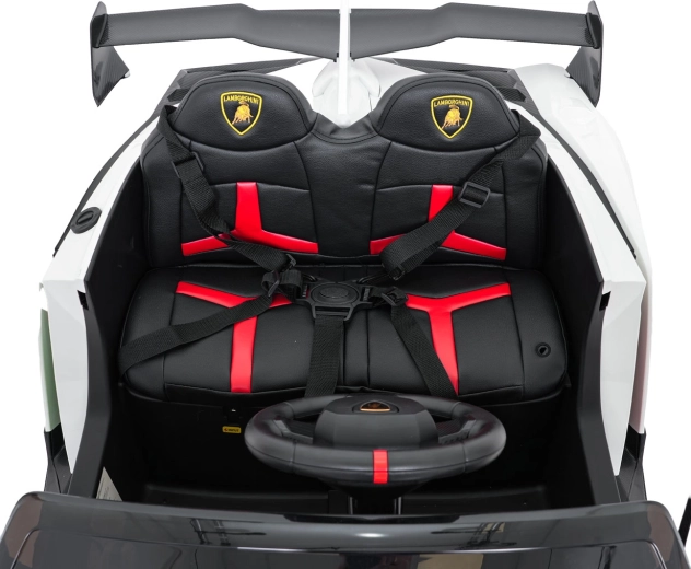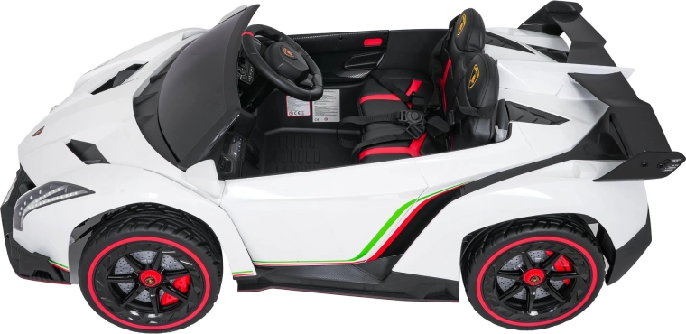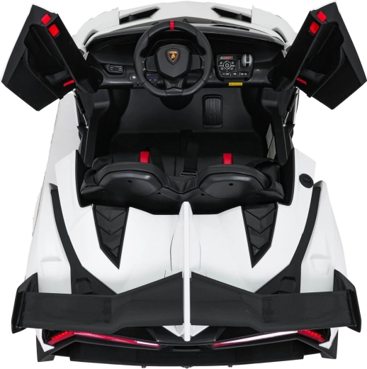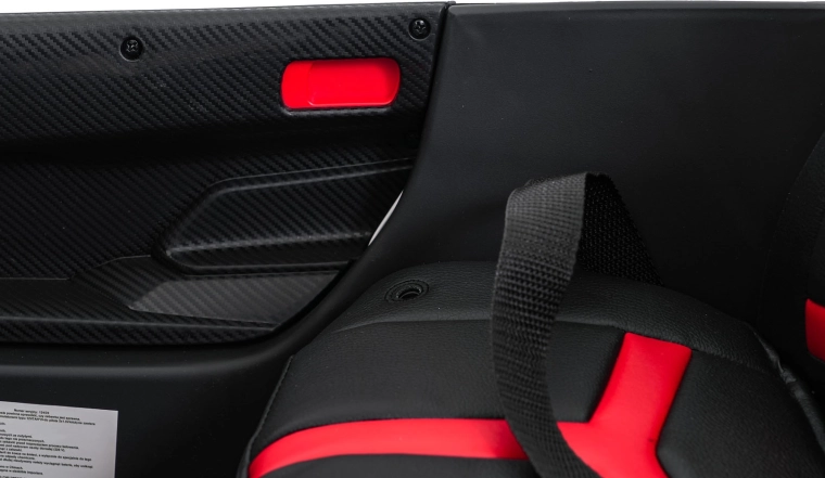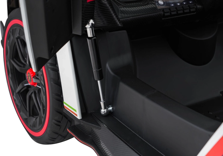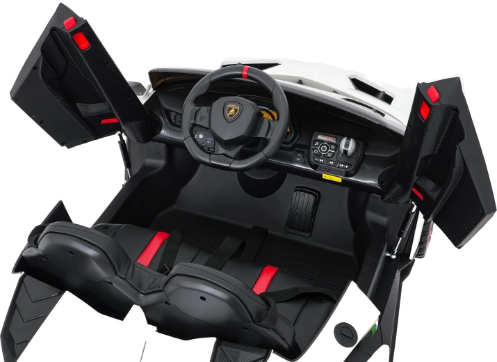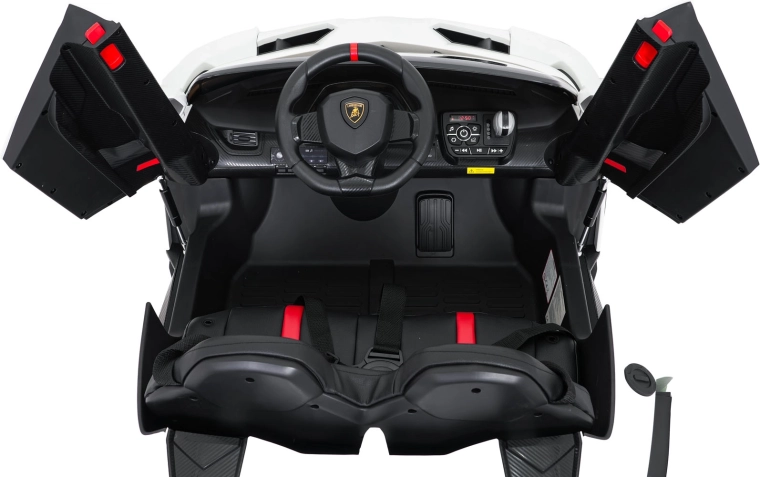 Der realistische Look wird durch aufklappbare Scherentüren, funktionale LED-Leuchten, sportliche Details und den zweisitzigen Sitz aus Eco-Leder mit Sicherheitsgurten unterstrichen. Die Bedienung ist im Cockpit intuitiv (Lenkrad, Pedal); das Fahrzeug kann außerdem vollständig mit der 2,4-GHz-Elternfernbedienung samt STOP-Taste für sofortiges Anhalten gesteuert werden.