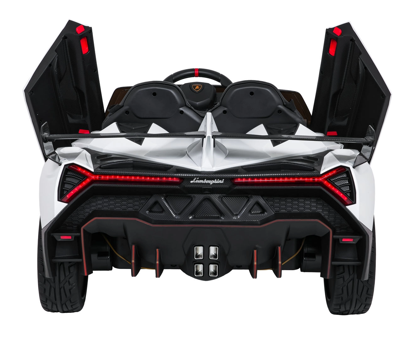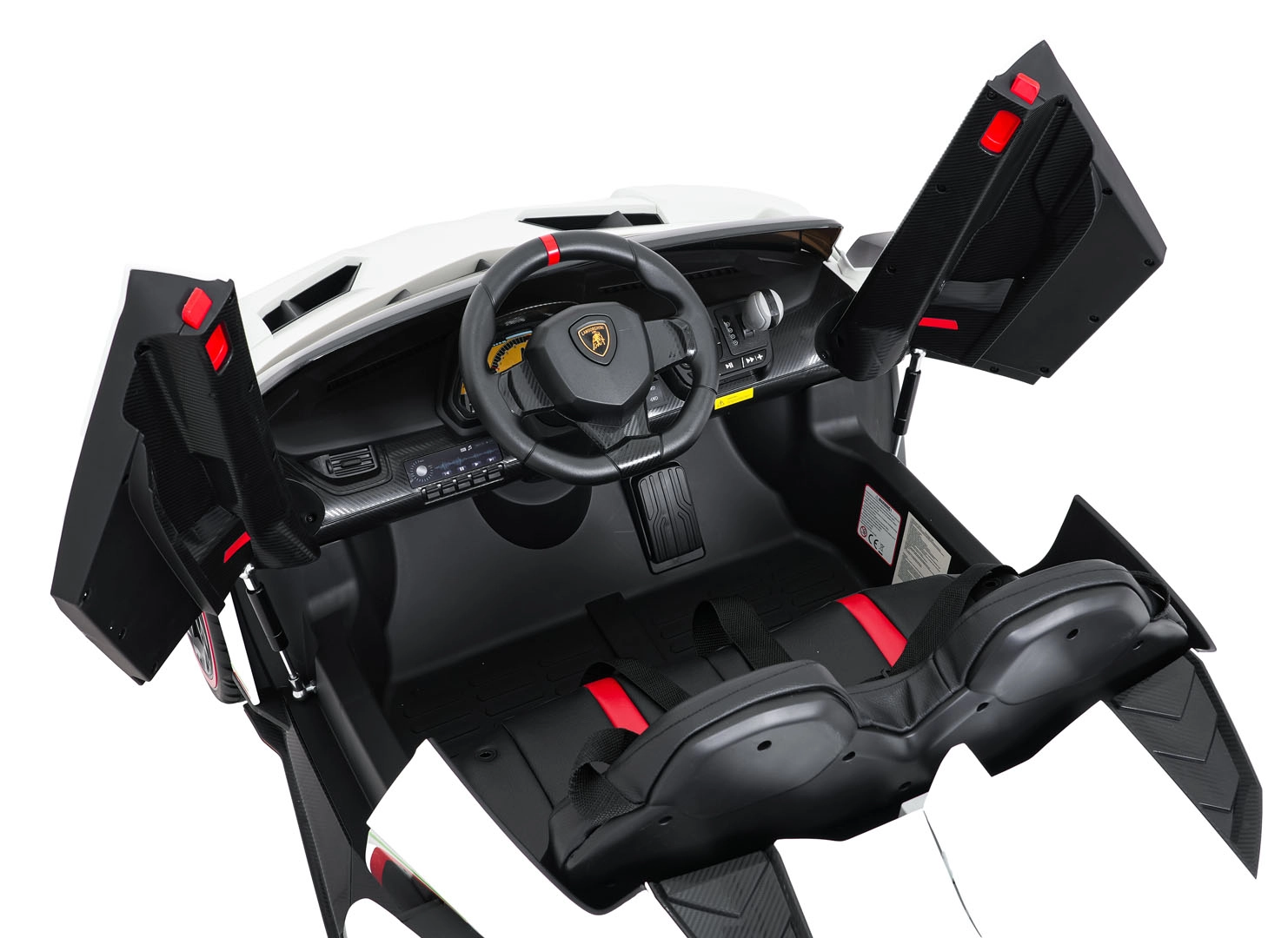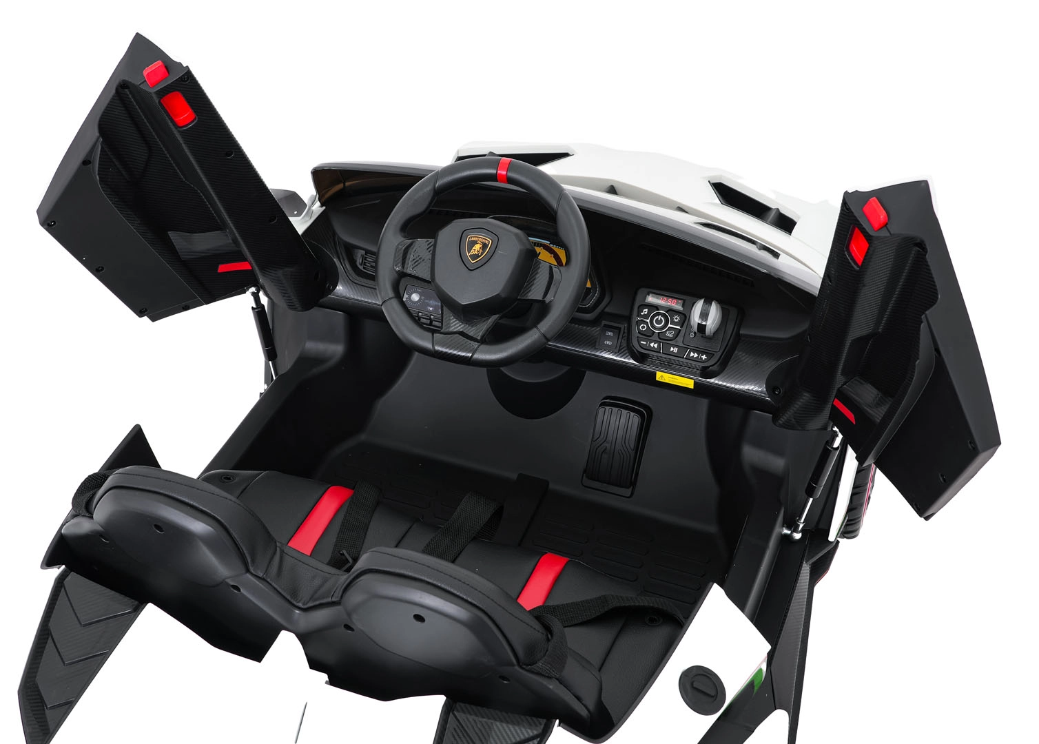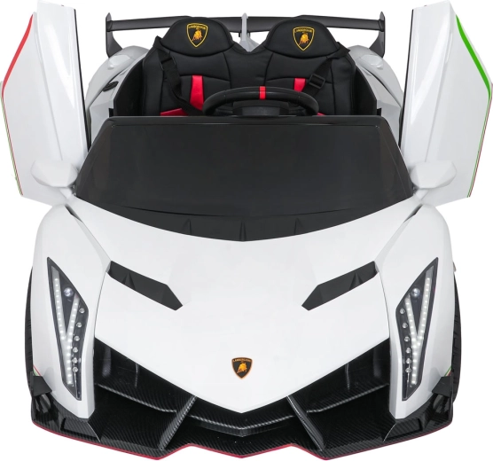 Der realistische Look wird durch aufklappbare Scherentüren, funktionale LED-Leuchten, sportliche Details und den zweisitzigen Sitz aus Eco-Leder mit Sicherheitsgurten unterstrichen. Die Bedienung ist im Cockpit intuitiv (Lenkrad, Pedal); das Fahrzeug kann außerdem vollständig mit der 2,4-GHz-Elternfernbedienung samt STOP-Taste für sofortiges Anhalten gesteuert werden.