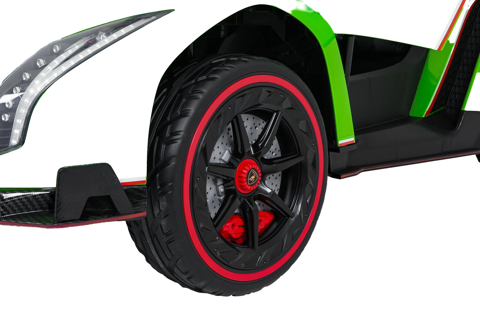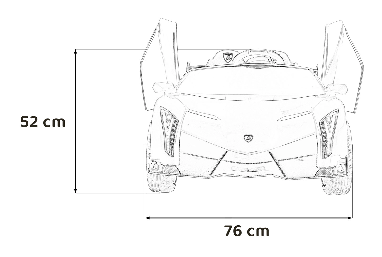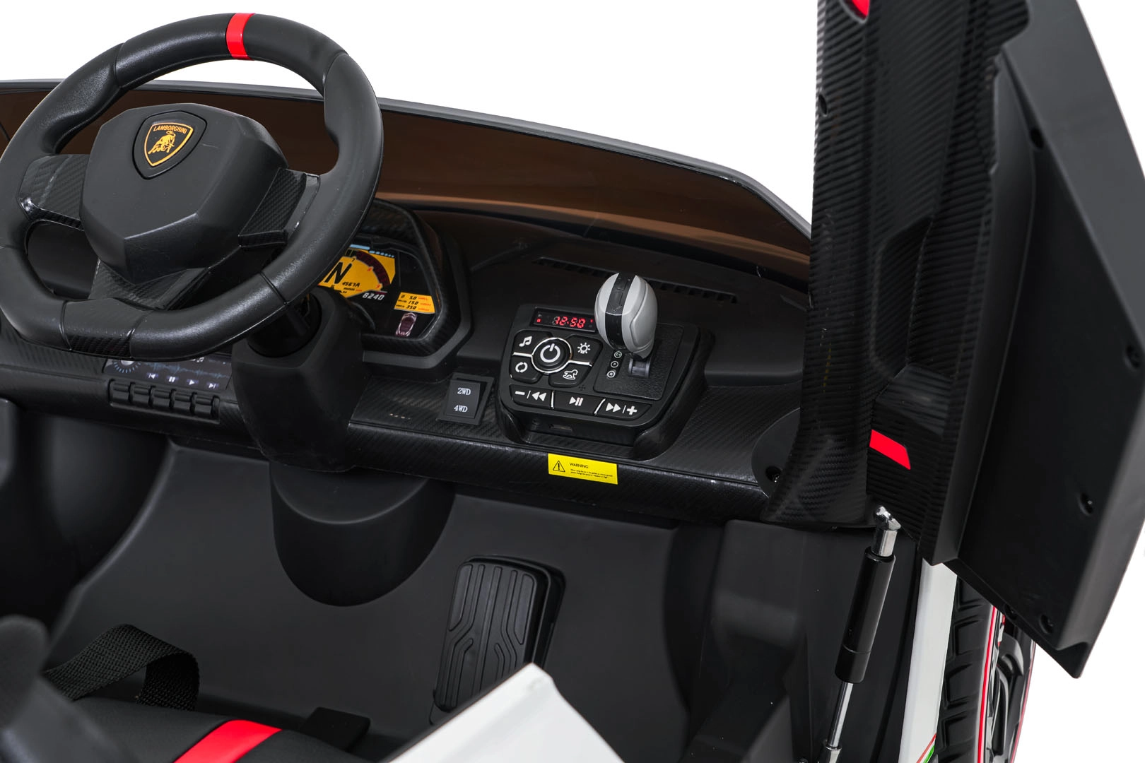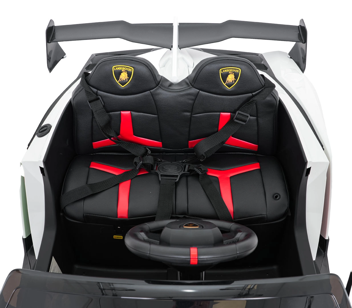 Der realistische Look wird durch aufklappbare Scherentüren, funktionale LED-Leuchten, sportliche Details und den zweisitzigen Sitz aus Eco-Leder mit Sicherheitsgurten unterstrichen. Die Bedienung ist im Cockpit intuitiv (Lenkrad, Pedal); das Fahrzeug kann außerdem vollständig mit der 2,4-GHz-Elternfernbedienung samt STOP-Taste für sofortiges Anhalten gesteuert werden.