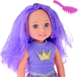 Die Puppe ist in einem stilvollen lila Kleid mit Kronenmotiv gekleidet, das ihr königliches Aussehen betont.