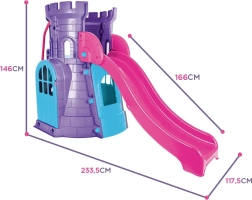 Woopie Schloss Turm mit Rutsche ist die ideale Kombination aus Häuschen und Rutsche - ein komplettes Mini-Spielfeld für Ihr Kind! Das Kind kann durch die Seitentür gehen und sich in seinem Turm verstecken. Das Häuschen hat viele Fenster und Öffnungen, die viel Licht hereinlassen. Der Turm kann über Stufen mit stabilen Geländern bestiegen werden. Darüber hinaus bietet das Schloss hohe seitliche Schutzvorrichtungen, die die Sicherheit Ihres Kindes beim Rutschen gewährleisten. Die Rutsche verfügt über eine lange, ausreichend steile Abfahrt von 166 cm Länge und wird jedes Kind vollends begeistern. Aktives Spiel im Schloss fördert die Entwicklung der Motorik des Kindes, was für eine gesunde Entwicklung unerlässlich ist. Hergestellt aus qualitativ hochwertigem Kunststoff, UV-beständig - ideal für draußen und drinnen!