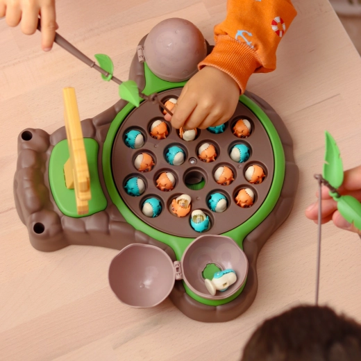 Begeben Sie sich auf prähistorische Angeltour mit einem Spiel, das Kinder sofort fesselt. Die runde Drehscheibe rotiert und die Dino-Mäuler öffnen und schließen sich rhythmisch – Ziel ist es, sie im richtigen Moment mit der magnetischen Angelrute zu fangen. Das Spiel fördert Geduld, Aufmerksamkeit und die Zusammenarbeit zwischen Kindern und Erwachsenen.