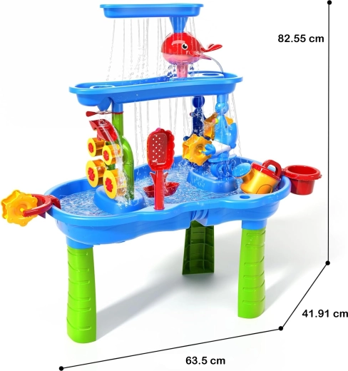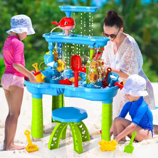 Der WOOPIE Wasser- und Sandtisch XL bietet Kindern das ganze Jahr über Spaß – im Sommer erfrischende Wasserattraktionen, in kühleren Zeiten kreatives Spiel mit Sand oder Kinetiksand. Dank des 3-stöckigen Kaskadensystems gießen Kinder Wasser in den oberen Behälter und beobachten, wie der Strom Wasserräder und Mühlen antreibt und in die unteren Wannen fließt. Im Set enthalten sind auch ein Hocker und ein umfangreiches Set an Werkzeugen für Spiel und Experimente.