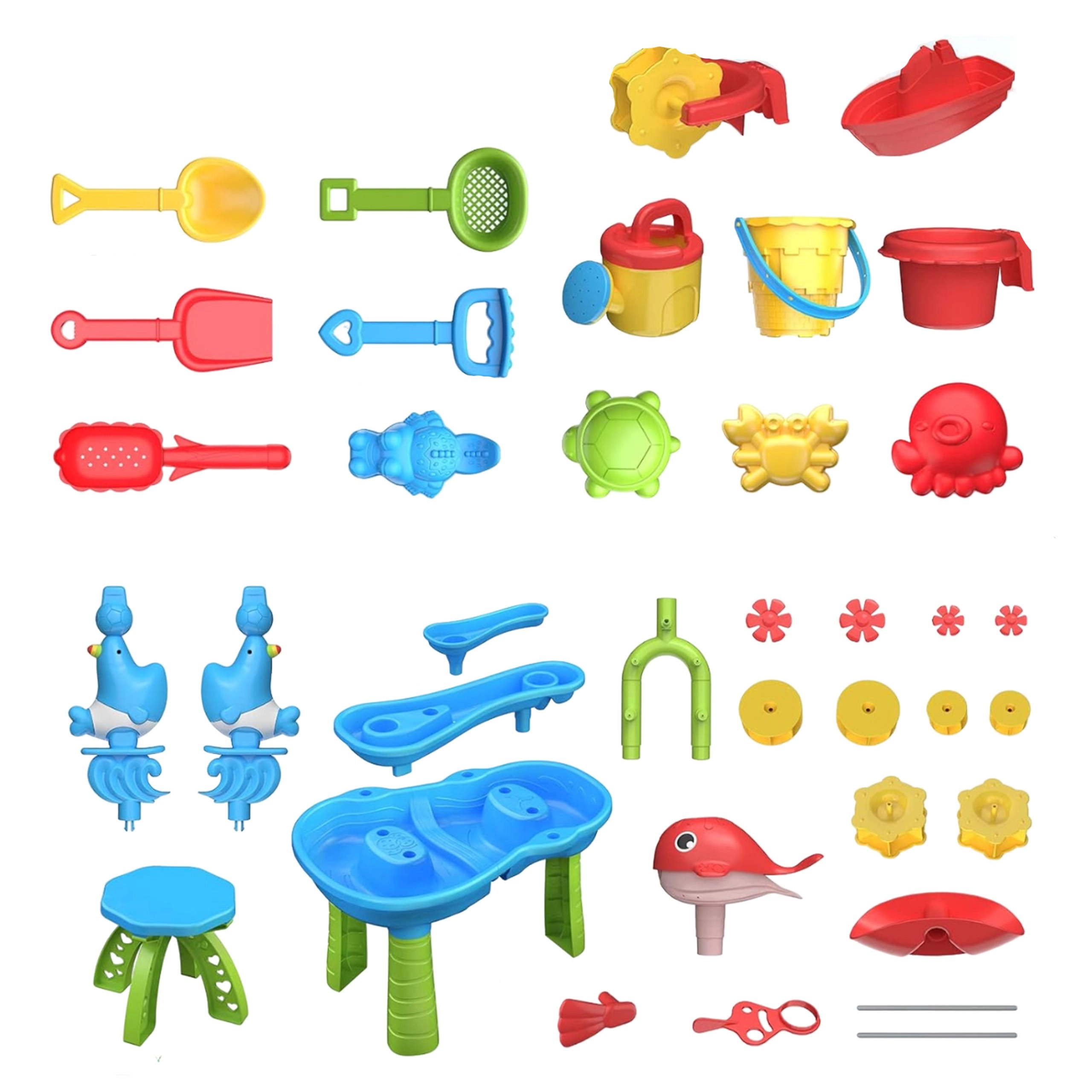 • 37-teiliges Zubehör: Eimer, Gießkanne, Förmchen, Schaufel, Harke, Sieb u. a.