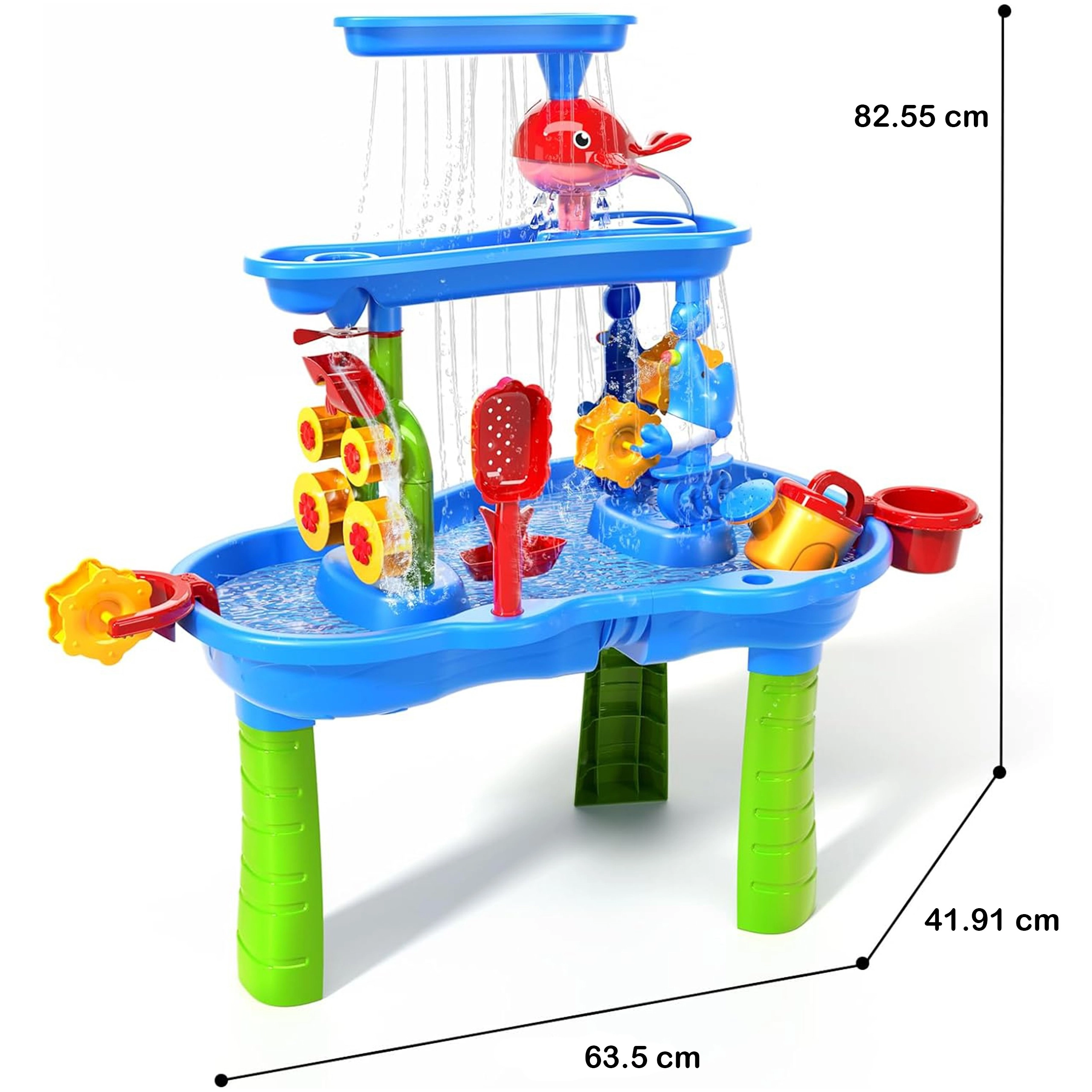 • 3 Ebenen Wasserfluss: eingießen, die Kaskade beobachten und Räder antreiben.