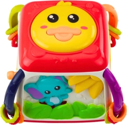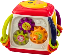 Der Würfel enthält interaktive Elemente wie Musiktasten und drehbare Zahnräder, die dem Kind stundenlangen Spaß und Anregung bieten.