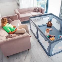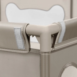 Auf- und Abbau sind unkompliziert und erfordern kein Werkzeug, was ihn auch für Reisen zur idealen Lösung macht. Der Laufstall ist mit geschützten Schaumstoffrohren ausgestattet, und die Konstruktionselemente befinden sich außen, um die Sicherheit des Kindes zu gewährleisten. In den Ecken sorgen Saugnäpfe für einen stabilen Stand.