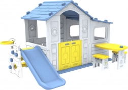 Rutsche, Basketballkorb und Tisch bieten viele Gelegenheiten für aktives Spielen.