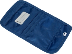 Die Geldbörse besteht aus recyceltem Textilgewebe mit verstärkten Kanten für längere Haltbarkeit. Die verstellbare Kordel mit Sicherheitsverschluss ermöglicht ein komfortables und sicheres Tragen am Hals, der Klettverschluss erleichtert das schnelle Öffnen und Schließen.