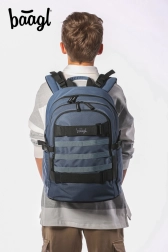 BAAGL Schulrucksack Skate Dust Blue ist ein leichter und stylischer Begleiter für Schulkinder ab der dritten Klasse. Hergestellt aus wasserabweisendem, recyceltem Material bietet er Komfort und Sicherheit dank reflektierender Elemente.