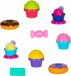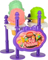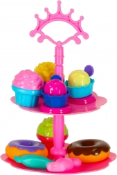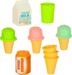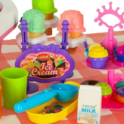 Der Lieferumfang enthält Spielzeuge wie Eiscremes, Donuts, Desserts, Milch, Saft, Becher, Süßigkeiten und sogar einen Eislöffel. Außerdem finden Sie ein Tablett, ein Servierbrett, einen Eisständer und eine praktische Plastiktischdecke.