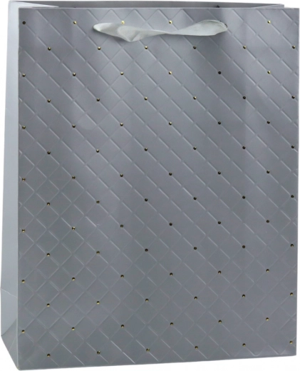 Diese stilvolle graue Geschenktüte ist die perfekte Wahl für alle, die moderne Eleganz und klassischen Look bevorzugen. Ihre dezente Farbe in Kombination mit dem geometrischen Muster und den goldenen Punkten verleiht ein anspruchsvolles Aussehen, ideal für Hochzeiten und festliche Anlässe.