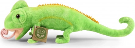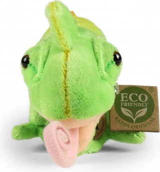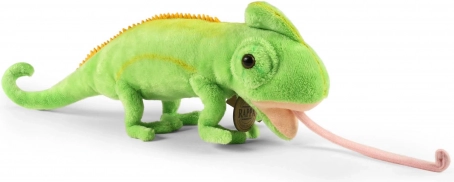 Gestickte Elemente, orangefarbene Rückenstacheln und eine niedliche rosa Zunge machen das Chamäleon zu einem treuen Plüschfreund.