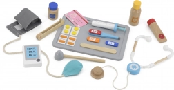 • Professionelle medizinische Instrumente wie Blutdruckmessgerät, Stethoskop, Thermometer, Reflexhammer, Röntgengerät, Injektionsspritzen, Tabletten und Medikamentenfläschchen,