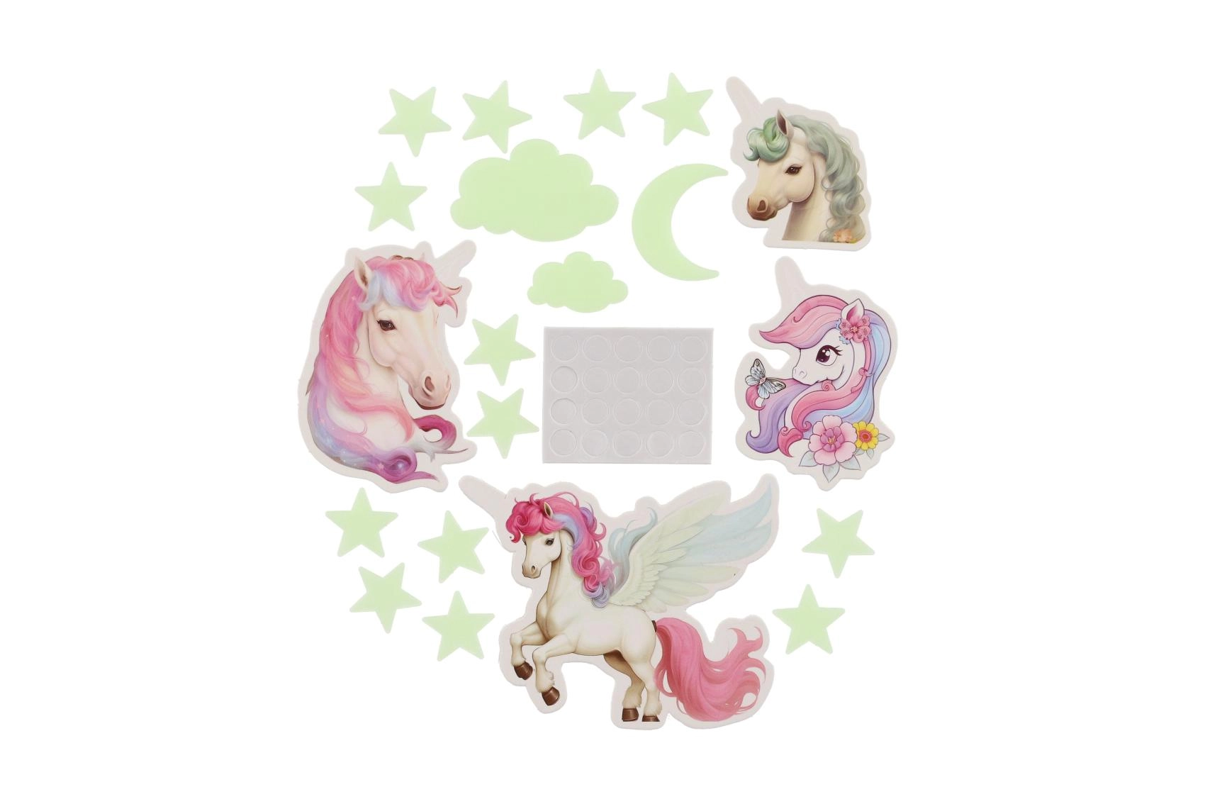 Erschaffen Sie für Kinder eine magische Welt direkt in ihrem Zimmer. Nach dem Aufladen strahlen die leuchtenden Einhörner und zaubern ein sanftes Licht, das beruhigt und beim Einschlafen hilft. Das Set enthält verschiedene Formen und Größen der Einhörner für kreatives Dekorieren von Wänden und Decken.
