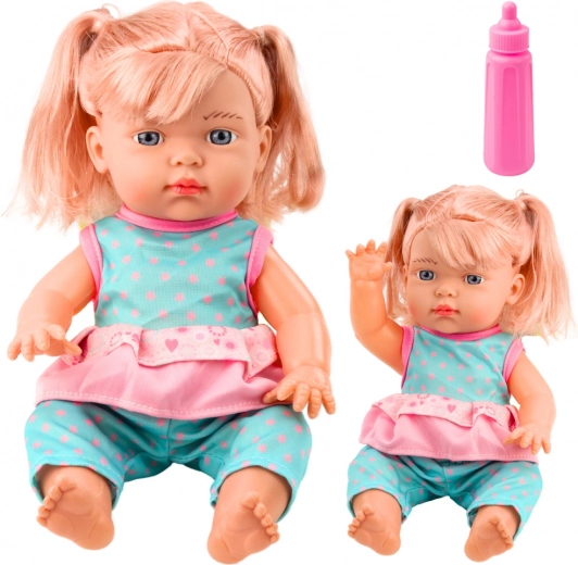 Die Puppe ist in einem einteiligen, abnehmbaren türkisfarbenen Outfit mit rosa Punkten und Rüschen gekleidet. Das Set enthält eine Flasche, mit der Kinder Fütterungs- und Pflegeszenen nachspielen können.