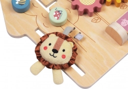 Aktivbrett in Hausform mit Löwenmotiv stimuliert die sensorische Wahrnehmung der Kinder durch sanfte Farben, niedliche Bilder und verschiedene Oberflächentexturen. Kinder lieben Aktivitäten wie das Perlenlabyrinth, dreh- und schiebbare Platten mit Tierbildern. Dieses Spielbrett fördert auch die Hand-Auge-Koordination und die Fantasie.