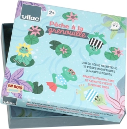 Der Packungsinhalt umfasst 12 hölzerne Magnetfrösche, 2 hölzerne Angelruten mit Magneten und 1 Spielbox/Basis. Dieses Spiel kann ab 2 Jahren gespielt werden und ist ideal für 2 Spieler.