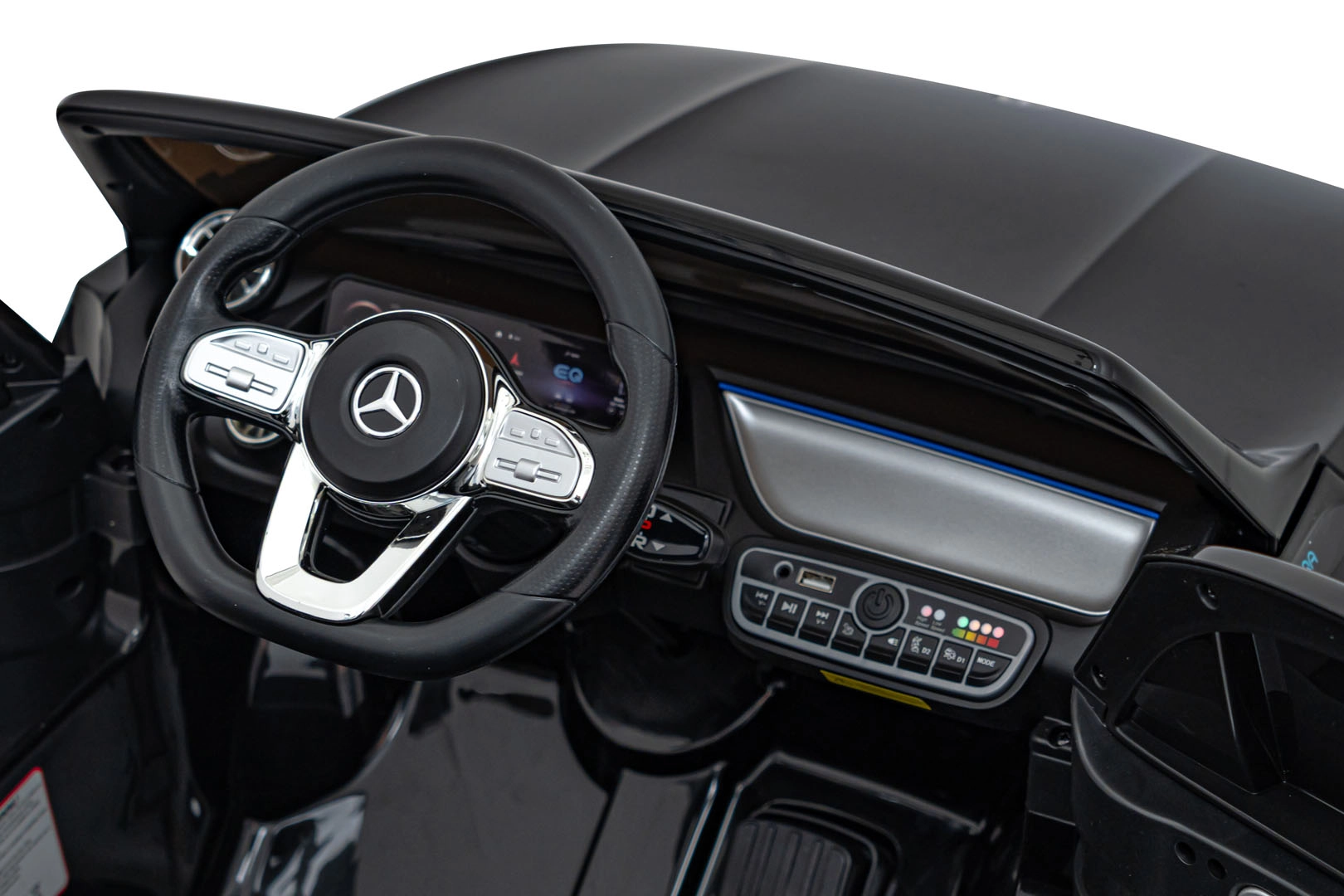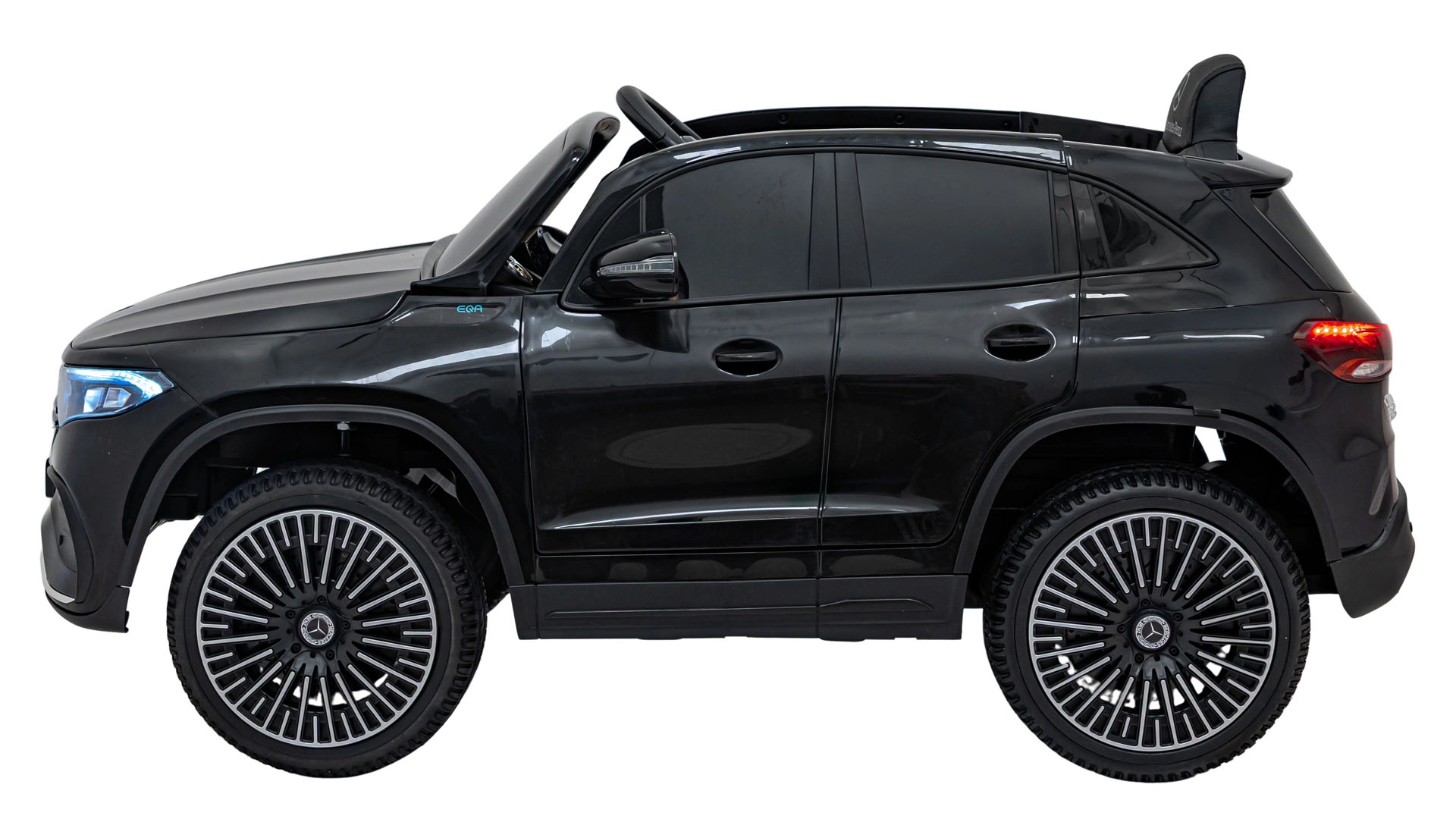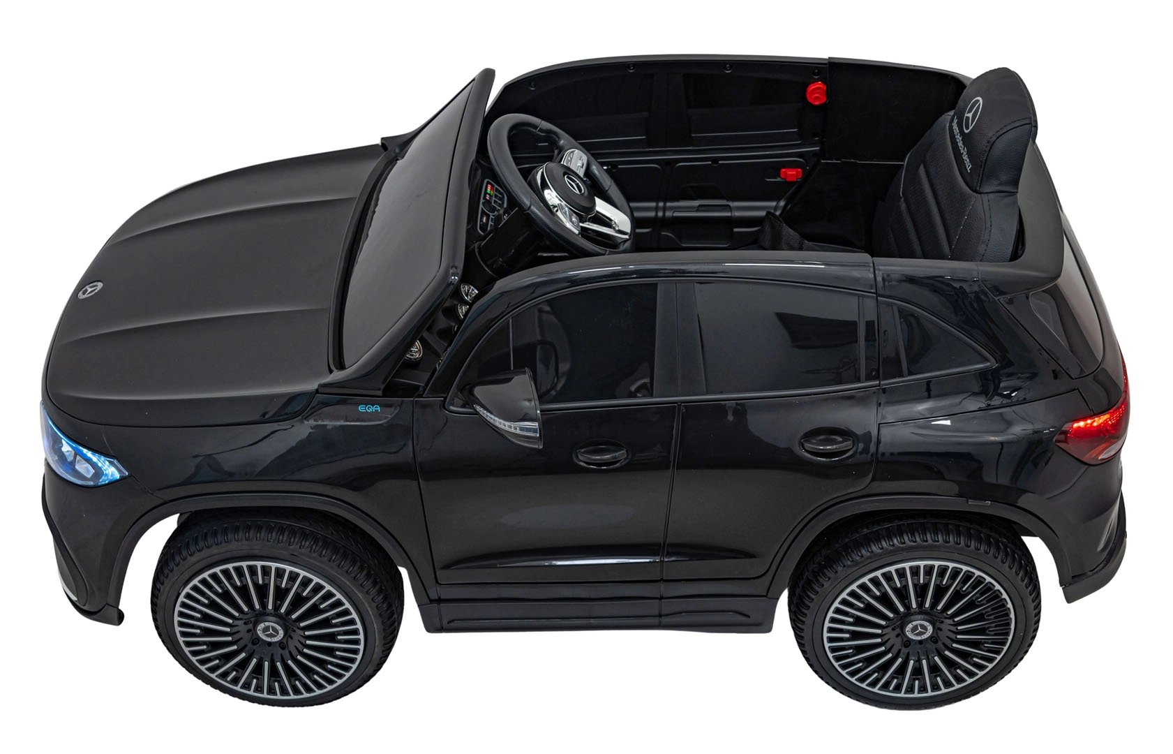 Für Unterhaltung sorgt das Multimedia-Panel mit Bluetooth, USB, AUX und MP3; außerdem Hupe und Sounds am Lenkrad sowie Ladezustandsanzeige. Dank der 2,4-GHz-Fernsteuerung behalten Eltern alles im Griff – inklusive Sicherheits-STOP. Der Innenraum mit Sitz aus Öko-Leder und Sicherheitsgurt wird durch LED-Front- und -Rückleuchten und authentische EQA-Details ergänzt.