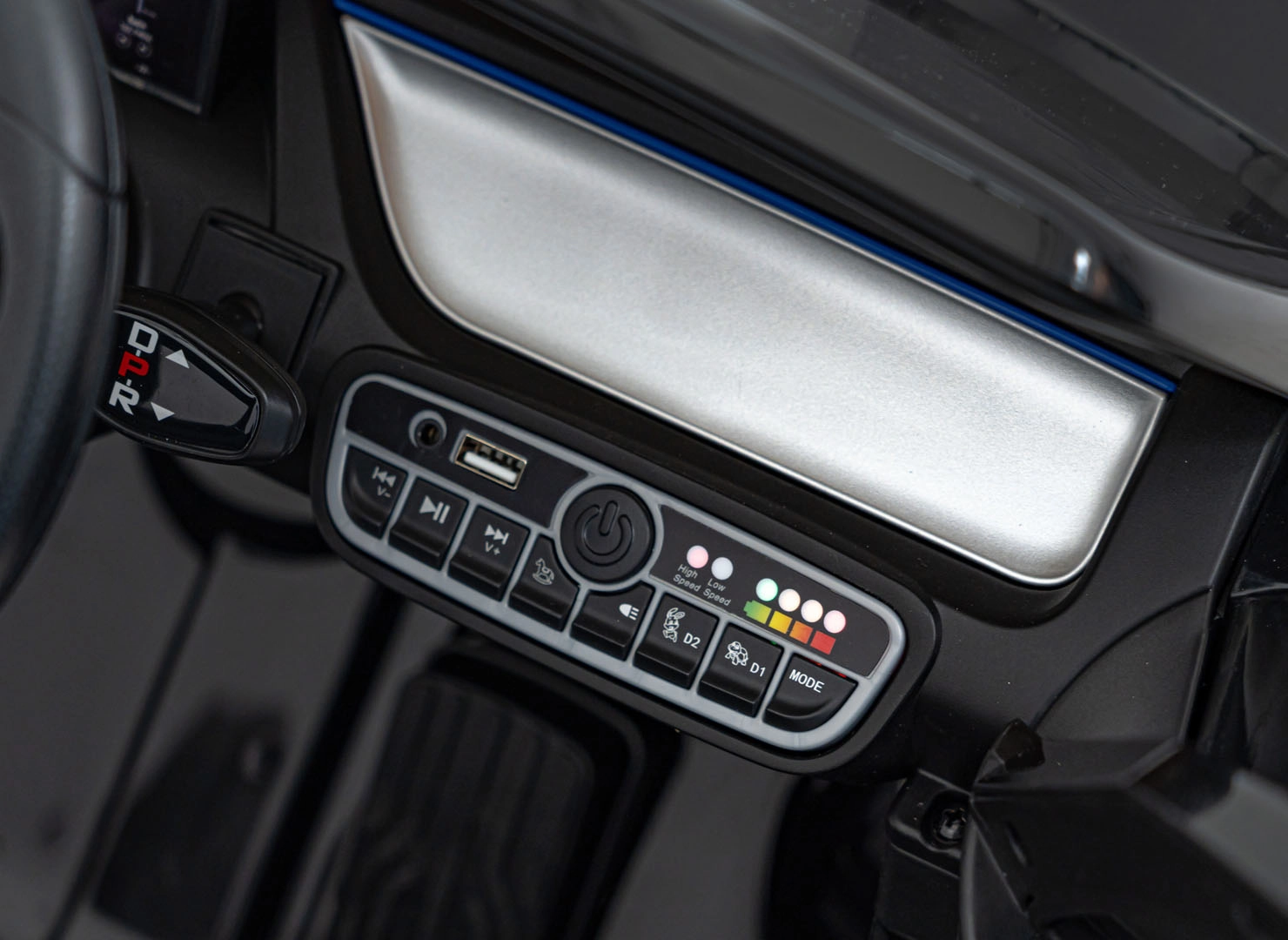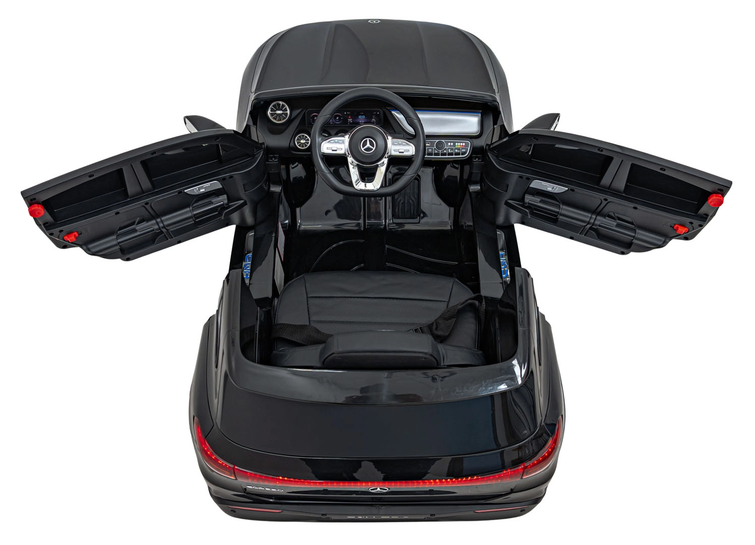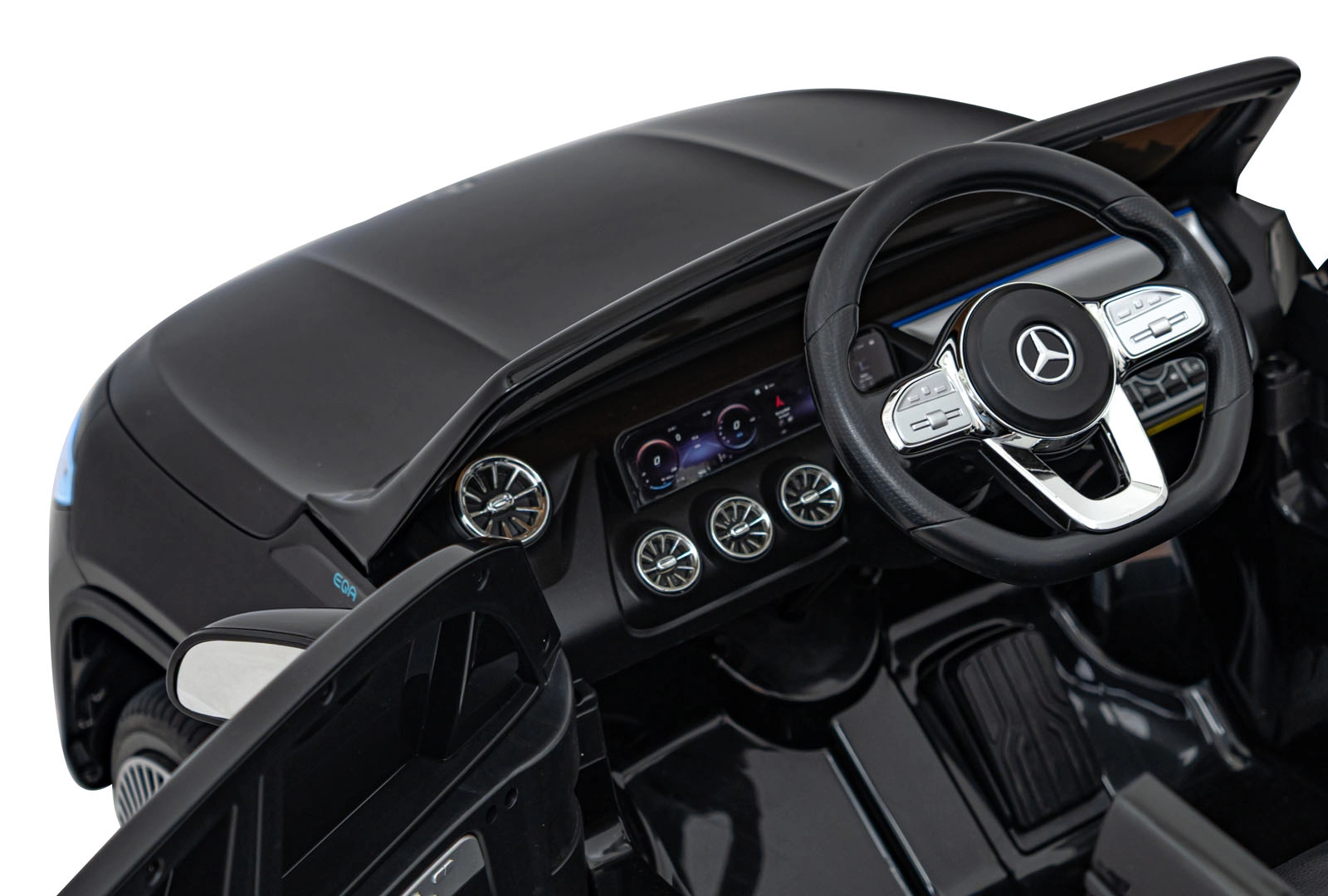 Für Unterhaltung sorgt das Multimedia-Panel mit Bluetooth, USB, AUX und MP3; außerdem Hupe und Sounds am Lenkrad sowie Ladezustandsanzeige. Dank der 2,4-GHz-Fernsteuerung behalten Eltern alles im Griff – inklusive Sicherheits-STOP. Der Innenraum mit Sitz aus Öko-Leder und Sicherheitsgurt wird durch LED-Front- und -Rückleuchten und authentische EQA-Details ergänzt.