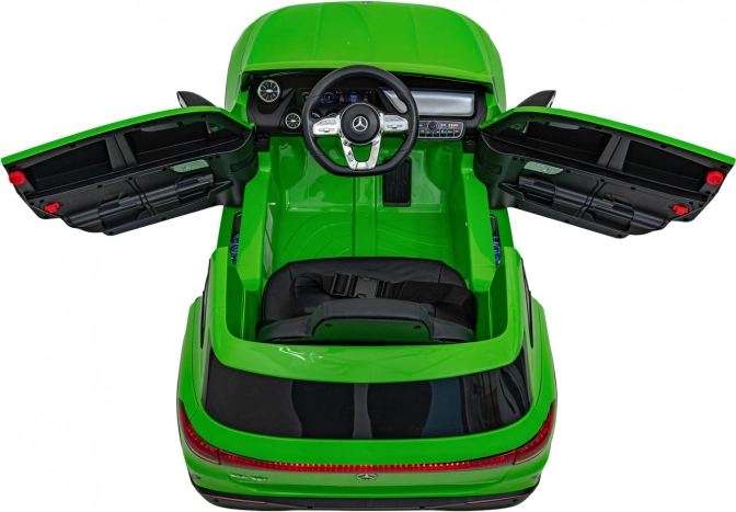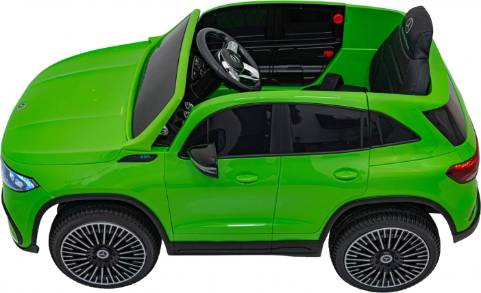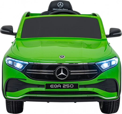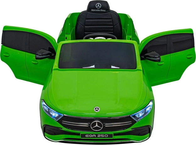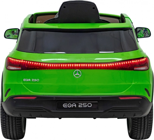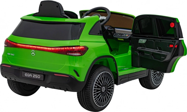 Stilvolles elektrisches Kinderauto MERCEDEs‑BENZ EQA 250 in Grün mit realistischem Design, 4×35 W Motoren, 12 V 10 Ah Batterie, öffnenden Türen, LED‑Lichtern und bequemem Sitz aus Eco‑Leder mit Gurten. Mit Bluetooth/USB/MP3/AUX Panel, 2,4‑GHz Fernbedienung mit Stop-Taste für maximale Sicherheit und weichen EVA‑Rädern für leises Fahren.
